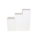 Our White Flower/Perfume Stand Set features three meticulously crafted stands, each designed to elevate your floral arrangements and perfume collections. With their pristine white finish and graceful design, these stands offer a clean and sophisticated backdrop that enhances the natural beauty of your flowers and the elegance of your fragrances. Transform your event into a floral and fragrance paradise with our White Flower/Perfume Stand Set of 3. \n \n Key Features \n \n Unique Square design \n Great Reception Centre piece \n decorative inspiration \n