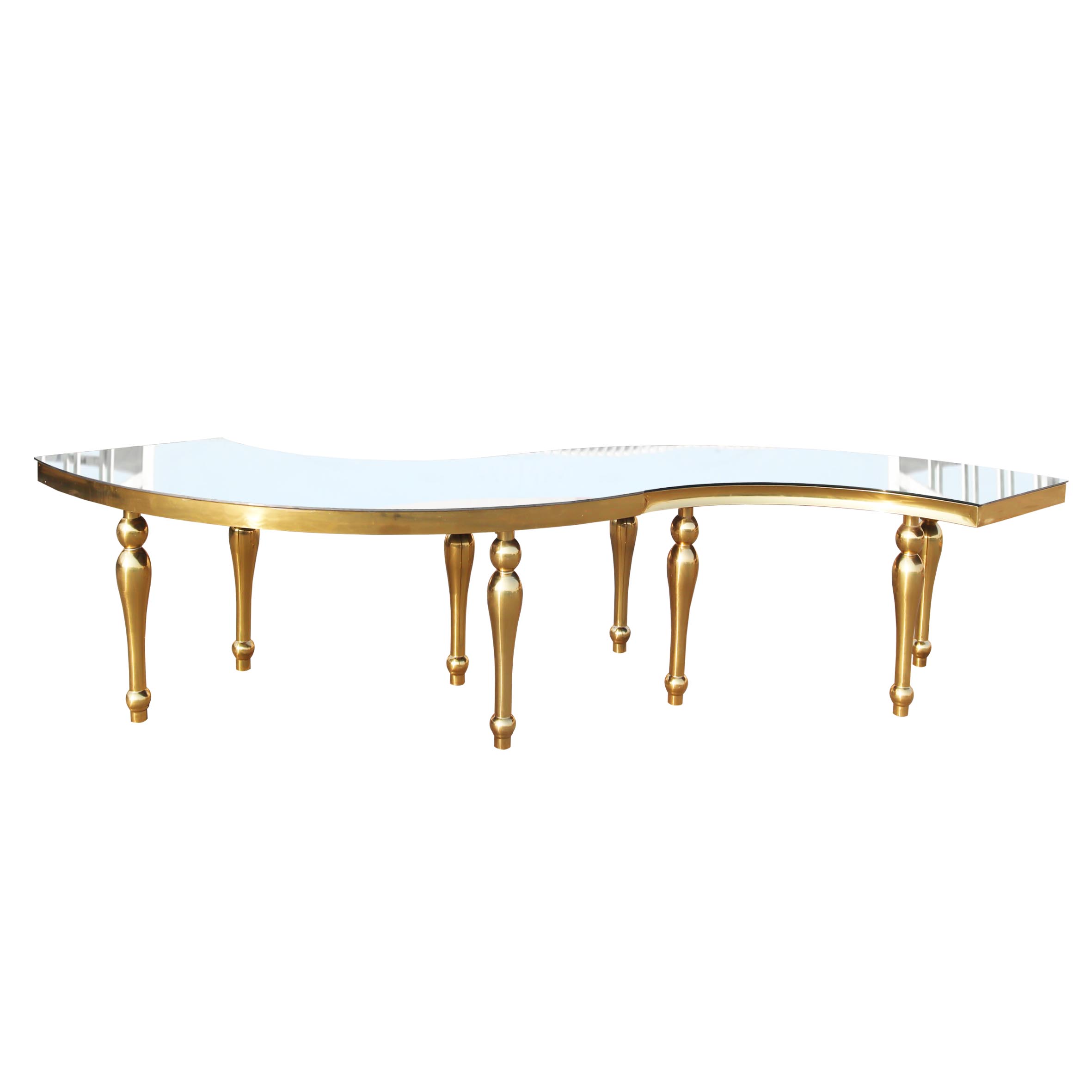 Our Top Gold S Shape Mirror Table is a work of art. The unique S-shaped design combined with the luxurious gold finish and reflective mirror surface creates a visually striking effect that catches the eye from every angle. This table is perfect for those looking to make a bold statement and leave a lasting impression on their guests. One of the standout features of our S Shape Mirror Table is its versatility. Whether you’re using it as a display table for a glamorous dessert spread, a chic cocktail bar, or a sophisticated seating arrangement, this table adapts to fit your needs. The mirrored surface enhances the beauty of your dĂ©cor and adds a touch of sparkle to any setting.